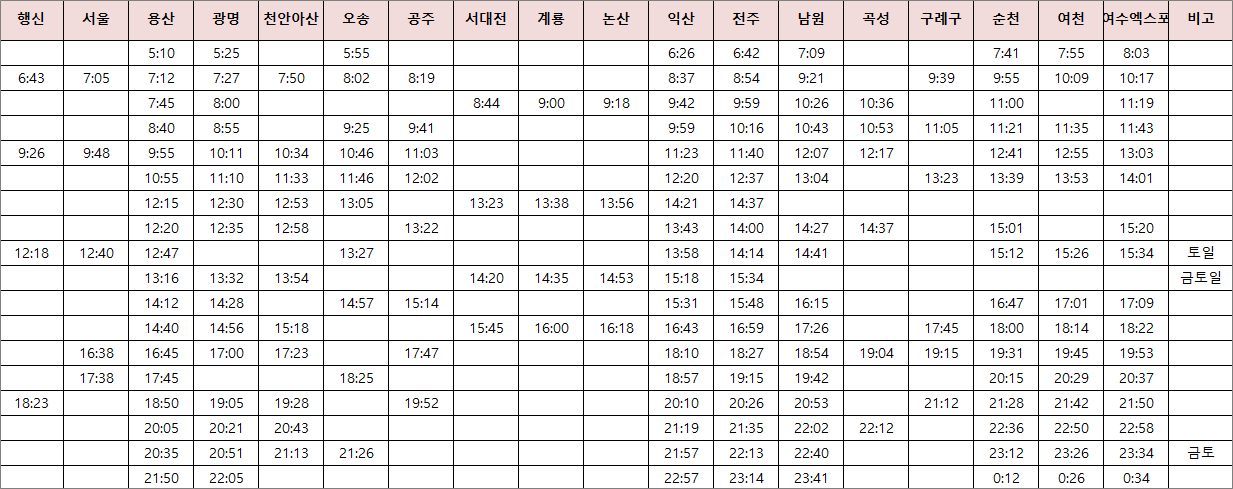 아래 는 코레일인포 홈페이지 > KTX > 전라선 정차역별 시간표를 확인할수있는 화면입니다.