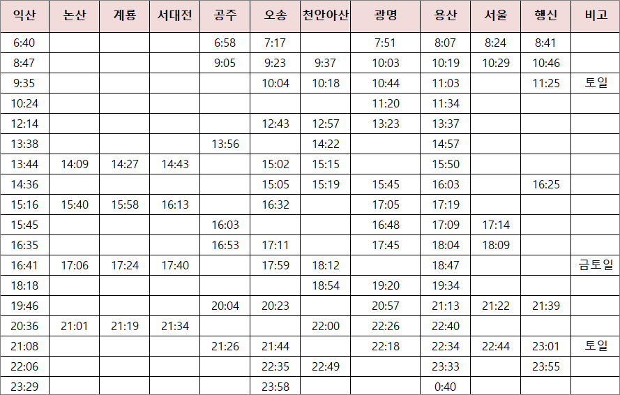 익산발 용산행 첫차(06:40), 막차(23:29)