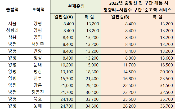 양평 기준으로 강릉선 정차역별 일반실/특실 요금표입니다