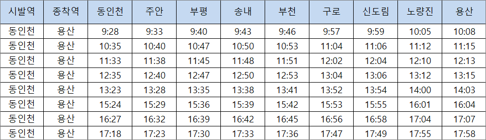 동인천과 서울 용산역을잇는 경인급행 특급 시간을 알아보겠습니다